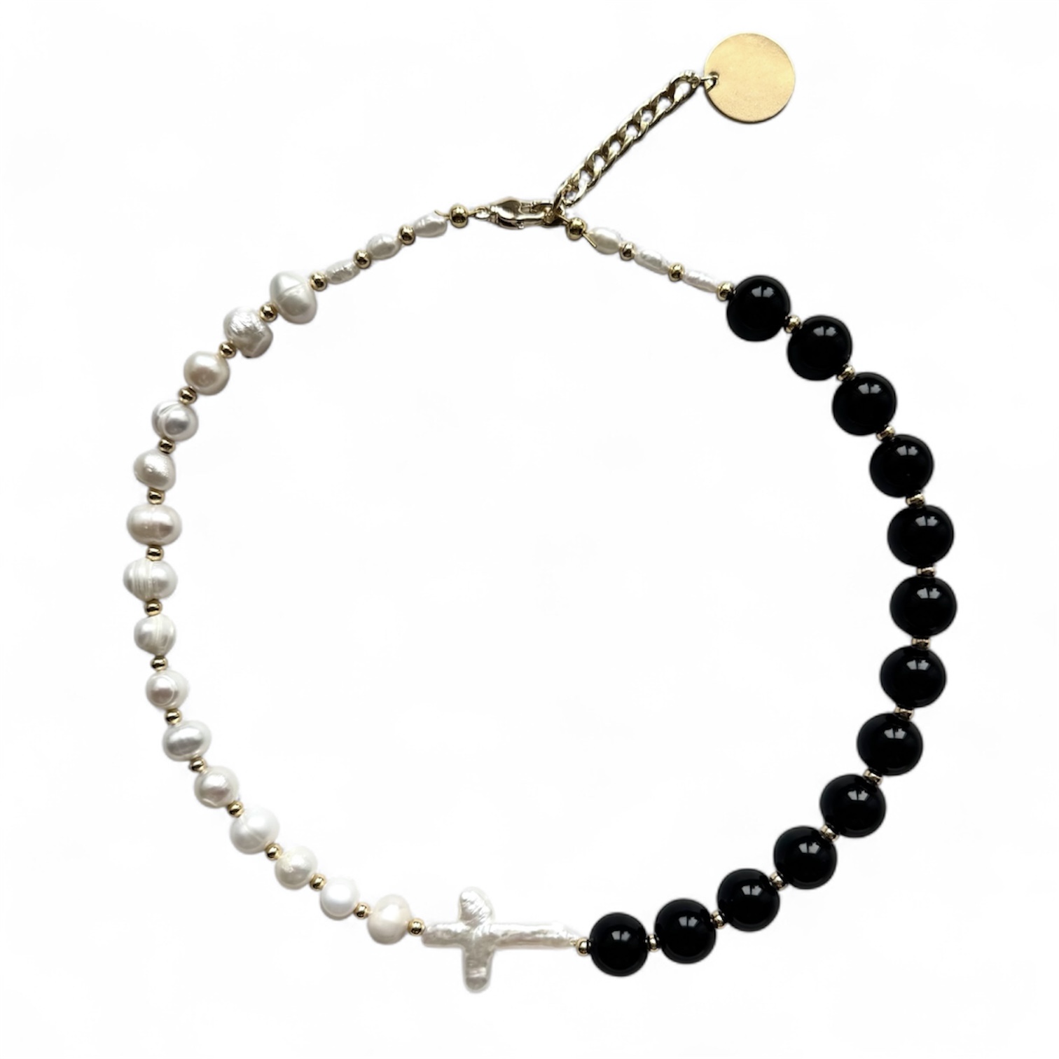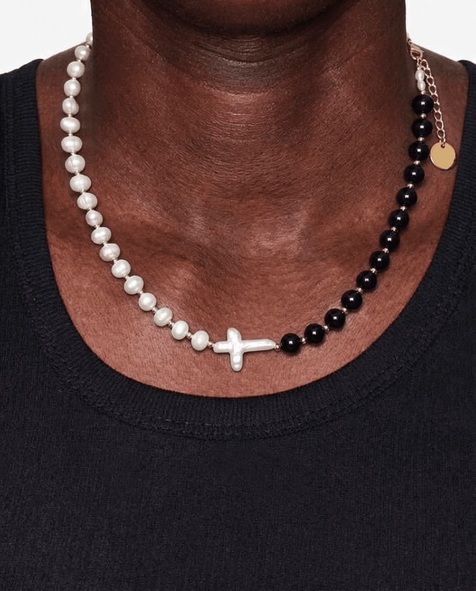 Черно-белое ожерелье для тех, кто не делит все на плохое и хорошее. Выполнено на 1/2 из жемчуга, на 1/2 из черного агата. В центре красуется, защищающий от всех мирских невзгод своего обладателя, жемчужный крест