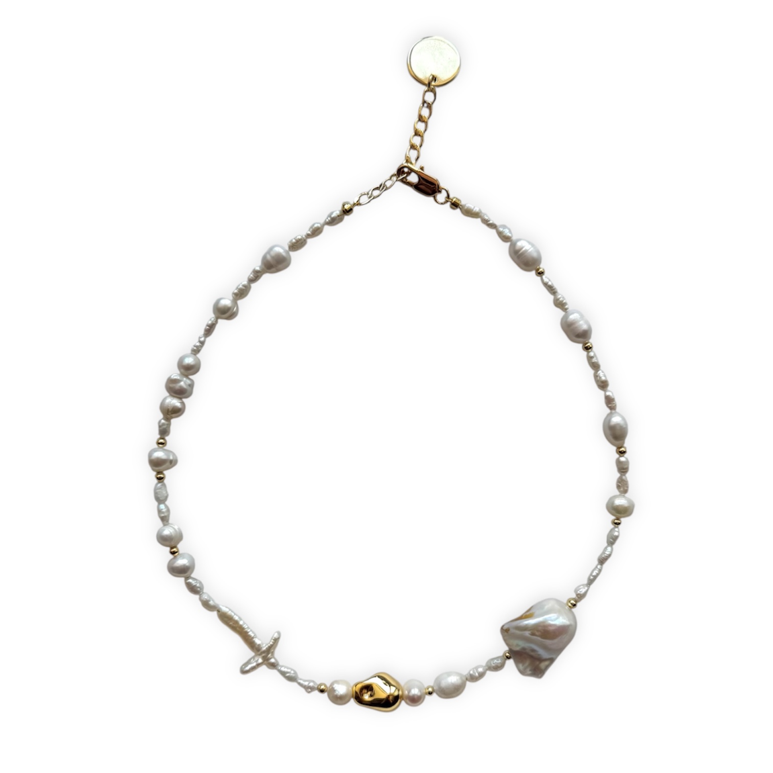 Ожерелье из асимметричного жемчуга разной крупности и формы: жемчужный крест и массивная барочная жемчужина создают неповторимый тандем, приковывая внимание окружающих к себе и заставляя обращать внимание на детали. Жемчужный ансамбль подчеркивает бунтарский, но в то же время нежный дух украшения. В центре красуется акцентный золотой боб